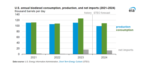 Although we do not explicitly forecast biodiesel imports, we do forecast net U.S. imports of biodiesel (imports minus exports). We forecast net biodiesel imports to be about the same in 2024 as in 2023 because of high imports early in the year and continued reduced demand in Europe. However, we expect net imports to level off over the course of the year as growing production of renewable diesel increases domestic biofuel supply.