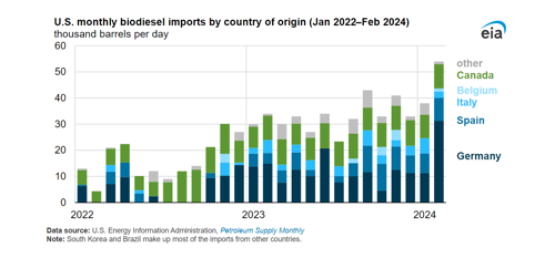 Where has the United States increased imports from? Much of the increase in U.S. biodiesel imports has come from Germany. From 2022 to 2023, U.S. biodiesel imports from Germany more than doubled to 11,000 b/d, making it the top source of U.S. biodiesel imports. Most of the remaining increase in U.S. biodiesel imports was from Spain, Italy, and Belgium, with small increases also coming from South Korea and Brazil.