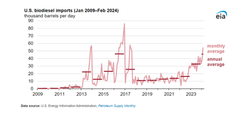 How much biodiesel has the United States been importing recently? The recent increase in U.S. biodiesel imports began in November 2022, when imports of biodiesel reached 30,000 b/d. U.S. biodiesel imports continued to grow in 2023 to 33,000 b/d and have increased further in 2024. In February 2024, the United States imported 54,000 b/d of biodiesel, the most for any month since June 2017.