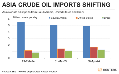 Americas crude surge. Asia has largely replaced Saudi barrels with crude from the United States and Brazil, according to LSEG data. Imports from the United States rose to 1.67 MMbpd in April, up from 1.40 MMbpd in March and 1.16 MMbpd in February.