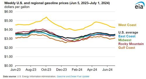 Weekly U.S. average gasoline prices have declined $0.19/gallon (gal) since the 2024 high on April 22, falling to $3.48/gal on July 1, $0.05/gal less than the price a year ago. Increasing gasoline inventories, relatively weak demand and oil prices below recent peaks are all contributing to falling gasoline prices, according to the U.S. Energy Information Administration (EIA).