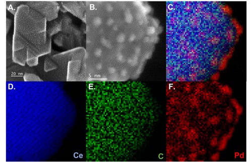 High-resolution electron microscopy images of the catalyst captured at the CFN. Frame A shows the catalyst with a scale bar representing 20 nanometers (nm) after three consecutive reaction cycles; B zooms in to reveal surface details; C provides a composite elemental map, with individual elements shown in D, E, and F. Together the images reveal that the active metal, palladium (Pd), is highly dispersed on the supporting cerium (Ce) substrate with a thin layer of carbon (C) at the interface. Source: Sooyeon Hwang/Brookhaven National Laboratory.