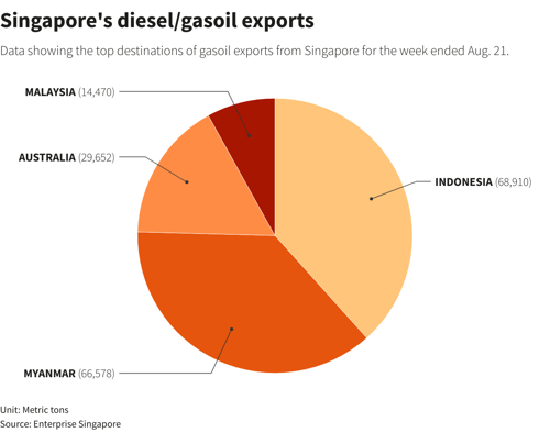 Commercial stockpiles of diesel/gasoil and jet fuel/kerosene at Singapore, a major global oil storage hub, were at 11.384 MMbbl for the week ended Aug. 21, compared with 12.016 MMbbl a week earlier.