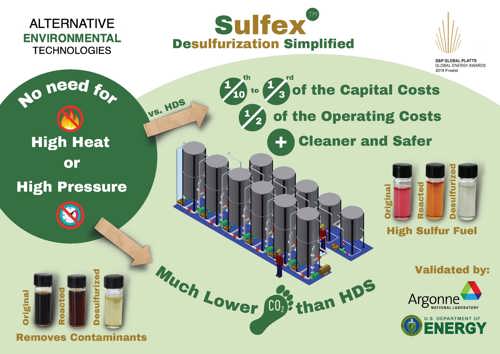 The intellectual property that is set forth in the newest patent further protects significant features and application methods of the Sulfex™ technology. The patent is directed to further desulfurization methods using the unique cross-flow of fuel, reagents and catalysts found within the standard Sulfex™ desulfurization plant. The method of desulfurization optimizes reagent and catalyst usage and longevity, so as to reduce capital costs, operating costs and plant footprint. Through these features Sulfex™ achieves high rates of desulfurization while minimizing catalyst and reagent use within the system while maximizing the fuel that can be processed by the catalysts and reagents. Further, such a configuration reduces processing time for such fuel processed within the system.