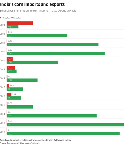 A push by India to make more corn-based ethanol has turned Asia's top corn exporter into a net importer for the first time in decades, squeezing local poultry producers and scrambling global supply chains.