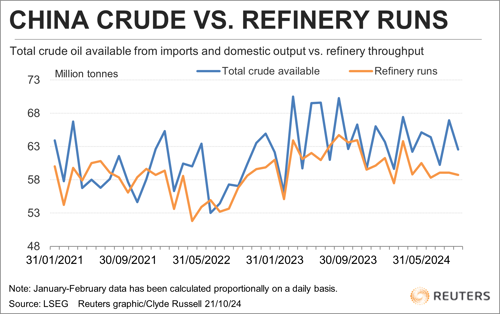 The softness in refinery throughput followed earlier data showing crude imports fell 0.6% in September from a year earlier, slipping to 11.07 MMbpd, the fifth straight month that imports were less than in 2023.