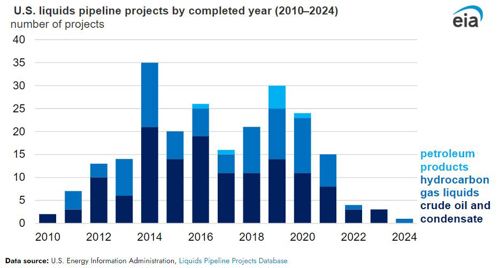 Four new petroleum liquids pipelines have been completed in the U.S. since 2023