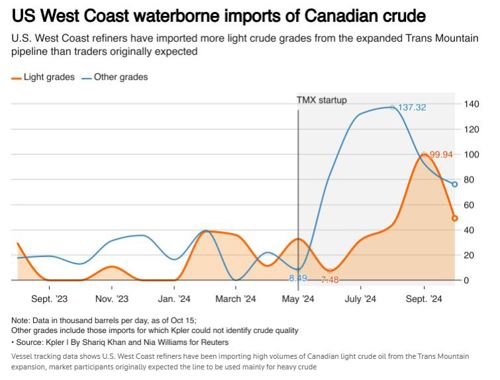 - Canadian light crude displaces Latin American imports to U.S. West Coast