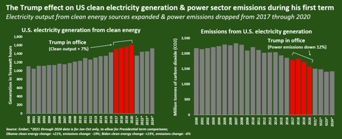 During Trump's first term, U.S. electricity production from clean sources increased by 7%, fossil-fired generation dropped by 4%, and total emissions from power generation declined by 12%, according to energy think tank Ember.