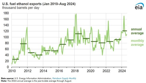 How much fuel ethanol has the U.S. exported so far in 2024? In the first eight months of 2024, U.S. fuel ethanol exports averaged 121,000 bpd—the most fuel ethanol exports in the first eight months of any year. Exports have been consistently high in 2024, exceeding 100,000 bpd in each of the first eight months of this year. In comparison, U.S. fuel ethanol exports exceeded 100,000 bpd in fewer than one-quarter of the months between 2019 and 2023.