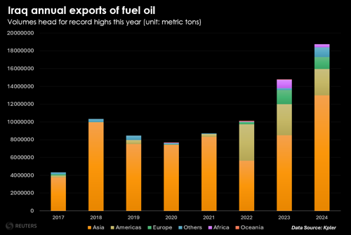 Iraqi fuel oil exports are on track to hit an all-time high above 18 MMt this year, according to industry sources and ship-tracking data, more than double exports in 2021.