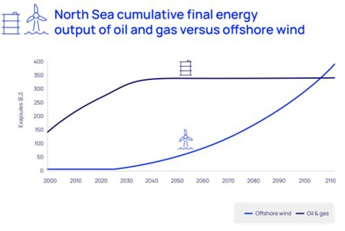 North Sea energy: The tortoise and the hare. The North Sea, once a significant source of oil and gas, was at the vanguard of the offshore wind sector. This chart plots oil and gas against offshore wind by quantifying the cumulative final energy output. Currently, the offshore wind capacity stands at 36 gigawatts (GW) and is projected to exceed 240 GW by 2050. Even so, it will be past the end of the century before the cumulative energy output of offshore winds surpasses that of oil and gas.