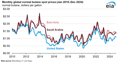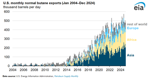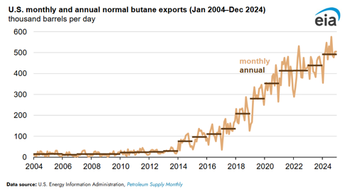 The United States is exporting record volumes of normal butane as global demand for liquefied petroleum gases (LPG) surges. U.S. normal butane exports averaged nearly 500,000 bpd in 2024, a 12% increase from the previous year, and have increased every year since 2006.