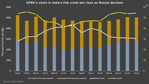 In February, imports of Russian oil fell 3% from January to about 1.54 MMbpd, with Moscow's share in New Delhi's overall crude purchases shrinking to the lowest since January 2024, the data shows.