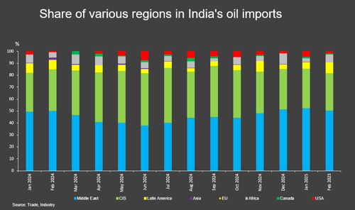 Russia's share in the overall oil imports by India, the world's third biggest oil importer and consumer, shrank marginally to about 30.5% in February while that of Latin America rose to 9%, the highest since December 2021, the data showed.