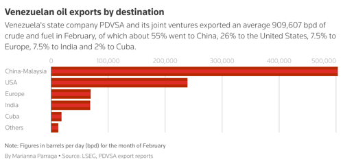 Oil is Venezuela's main export and China, which is already the subject of U.S. tariffs, is the largest buyer. In February, China received directly and indirectly some 503,000 bpd of Venezuelan crude and fuel, some 55% of total exports.
