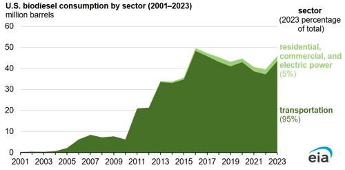 Biodiesel is a renewable fuel produced using fats, oils, or greases usually blended with petroleum diesel and consumed by trucks. In 2023, the most recent year for which we have estimates, the transportation sector accounted for about 95% of the nearly 46 MMbbls of biodiesel consumed in the U.S.