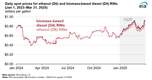 Biofuel compliance credit prices. The prices for biomass-based diesel (D4) and ethanol (D6) renewable identification number (RIN) credits—the compliance mechanism used for the Renewable Fuel Standard (RFS) program administered by the U.S. Environmental Protection Agency (EPA)—have been higher in 1Q 2025 than in 2024 because of higher feedstock prices and less production of biodiesel and renewable diesel—the two fuels that generate most D4 RINs. RIN prices peaked in late February and again in late March, when they were higher than at any time since 2023.