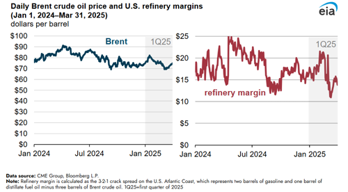 During the first quarter (1Q) of 2025, crude oil prices generally decreased while U.S. refinery margins initially increased before decreasing in the final month of the quarter. In its quarterly update, the U.S. Energy Information Administration (EIA) reviews petroleum markets price developments in 1Q, covering crude oil prices, refinery margins, biofuel compliance credit prices and natural gas plant liquids prices.