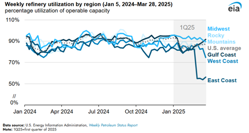 Refinery margins. U.S. refinery utilization started 2025 at 93% but fell below 90% beginning in mid-January, ending the quarter at 86%. Midwest utilization was particularly high, remaining above 90% through all but the last week of the quarter. West Coast utilization fell from 80% to 90% in January and February to below 75% in late March, partly due to an outage at PBF Energy’s Torrance refinery as well as a major outage at the company’s Martinez refinery, both in California. East Coast utilization started the year at 83% but decreased below 60% in late February and through March, ending the quarter at 59%. This reflects normal spring maintenance and a major turnaround at Phillips 66’s Bayway refinery in Linden, New Jersey. After undergoing seasonal maintenance, Gulf Coast utilization began increasing in March going into the second quarter as refiners prepare for the summer demand season.