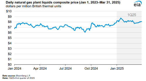 Natural gas plant liquids. The natural gas plant liquids (NGPL) composite price at Mont Belvieu, Texas, rose 10% in 1Q 2025 compared with the previous quarter to an average of $8.10 per million British thermal units (MMBtu), driven by gains in ethane and propane prices.