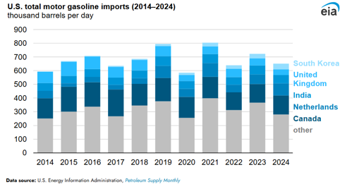 According to data from the U.S. Energy Information Administration (EIA), motor gasoline makes up the largest share of U.S. petroleum product imports because it is the most widely consumed petroleum fuel in the United States. In 2024, the United States imported 651,000 bpd of motor gasoline, about 36% of all petroleum product imports and 75,000 bpd less than in 2023. U.S. gasoline consumption in 2024 was largely unchanged from 2023; inventories fell in 2024 after they had increased in 2023, reflecting the decrease in imports.