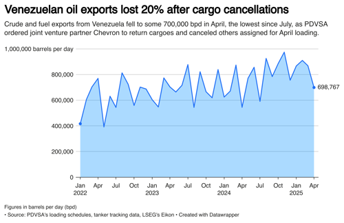 Venezuela's oil exports fell almost 20% to some 700,000 bpd in April, the lowest level in nine months, as cargo cancellations to U.S.-based producer Chevron forced ships to return and left some ports empty, ship tracking data and documents showed.