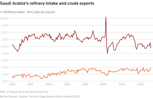 Saudi Aramco placed 28% of its crude oil production in domestic refining operations in 2024, up from 26% the previous year, according to its annual report. It also supplied 53% of the crude used by its joint venture refineries abroad.