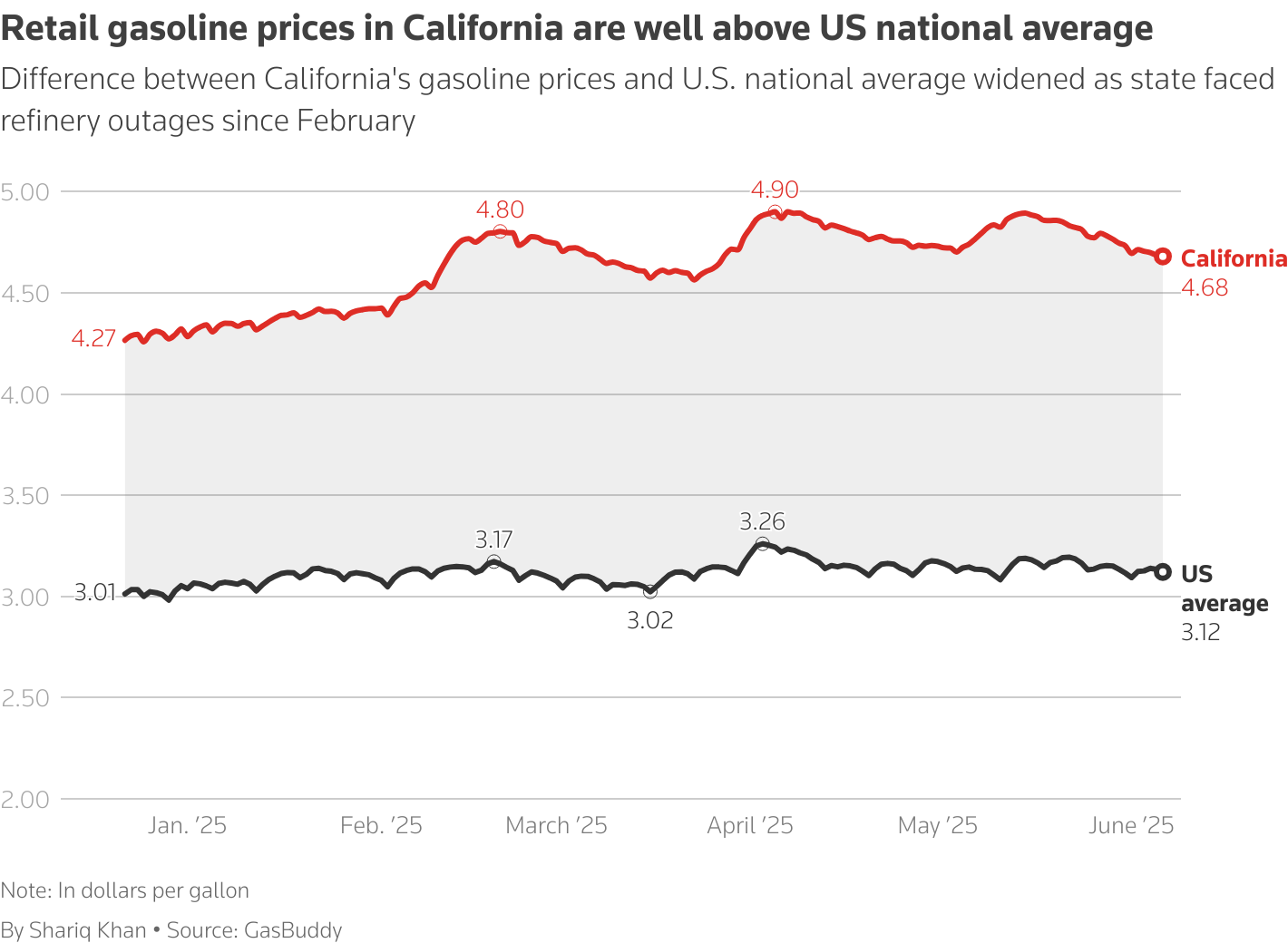 Retail gasoline prices averaged $4.68 a gallon in California on Friday, while the national average was $3.12, according to GasBuddy data.