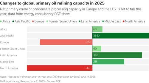 In the U.S., LyondellBasell's Houston refinery was shuttered this year, while Phillips 66's Los Angeles refinery and Valero's Benicia refinery are set to close in October 2025 in April 2026 respectively.