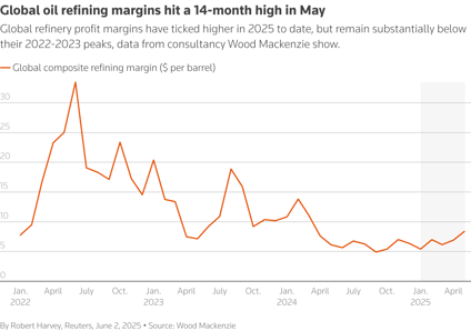 Global composite refining margins reached $8.37 per barrel in May 2025, according to consultancy Wood Mackenzie, their highest since March 2024, but still much lower than the $33.50 average in June 2022 during the post-pandemic demand recovery and in the wake of Russia's invasion of Ukraine.