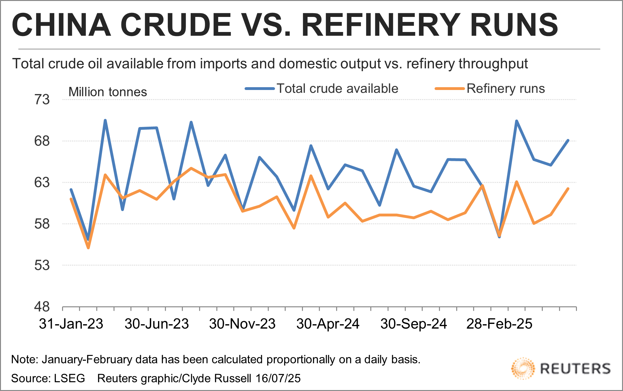 China does not disclose the volumes of crude flowing into or out of strategic and commercial stockpiles, but an estimate can be made by deducting the amount of oil processed from the total of crude available from imports and domestic output.