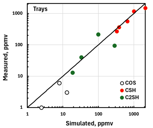 The simplest way to compare simulation with plant measurements is on a parity basis. FIGS. 3 and 4 compare measured and simulated mercaptans and COS levels in the treated liquid from trayed and packed columns, respectively. Given the approximations and estimates that had to be made to fill in missing data from sometimes sketchily documented equipment and operating conditions, the extent to which simulations reproduce performance metrics is remarkable. It should be emphasized that the simulated results shown here are, in every sense, pure predictions. They certainly lend credence to the efficacy of the fundamental model used as the basis for the simulator. It seems that most of the treater details germane to tray and packing performance in sour, liquid-hydrocarbon service have been properly quantified.