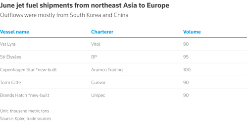 Northeast Asia sends the most jet fuel to Europe in nearly a year in June