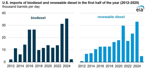 U.S. imports of biodiesel and renewable diesel significantly decreased in the first half of 2025 compared with the same period in previous years. This decline is primarily due to the loss of tax credits for imported biofuels and generally lower domestic consumption of these fuels.
