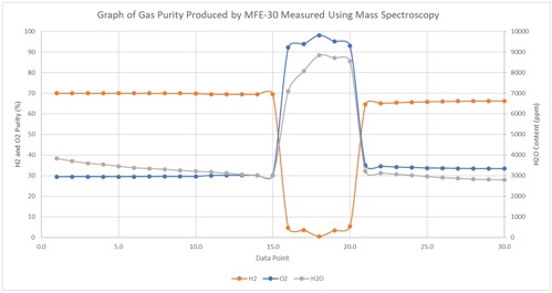 Process MS contributes at both development and operational levels. For example, experiments performed on membrane-free electrolyzers by Clean Power Hydrogen (CPH2) demonstrated how magnetic sector MS enables real-time evaluation of gas purity and phase separation performance. FIG. 2 shows MS data from the cryogenic stage downstream of the electrolyzer during a fault condition, the hydrogen concentration is only ~70%, the limitation is caused by excess liquid oxygen, when this is lifted for a brief period the hydrogen content rises quickly. This real-time data from the MS enables rapid fault diagnosis and subsequent improvements to system design.
