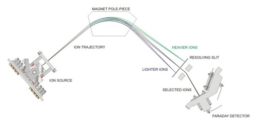 The analytical core: Magnetic sector mass spectrometry. Process MS has been used in the energy and chemical sectors for decades, but its versatility and robustness make it uniquely suited for e-fuel production. A scanning magnetic sector mass spectrometer separates ions according to their mass-to-charge (m/z) ratio in a magnetic field. The ion source, typically operating under high vacuum (~10⁻⁶ mbar), ionizes gaseous samples via electron impact (EI), those ions are accelerated into a variable magnetic field where they are separated according to their mass to charge ratio then quantified using a faraday detector. The mass spectrum recorded is characteristic of the sample’s composition. A schematic of a scanning magnetic sector MS is shown in FIG. 1.