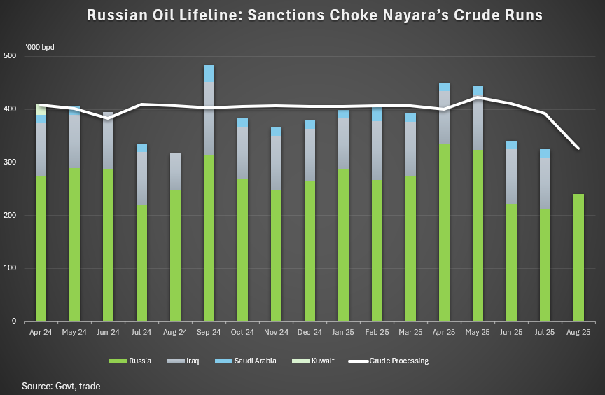 It has been forced to reduce crude runs at its 400,000-bpd Vadinar refinery to 70%–80% of capacity - it was previously running at 104% - as it struggles to find export buyers for its fuel and banks to facilitate payments, sources with knowledge of the refinery operations say.
