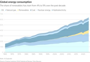 Ten years on, global renewables consumption has tripled, with solar alone growing more than seven-fold, according to the Energy Institute's 2024 Statistical Review. But the hard truth is that fossil fuel consumption has continued rising, with the share of wind and solar in the world's energy mix growing from 4% to 9% of the mix over the past decade.