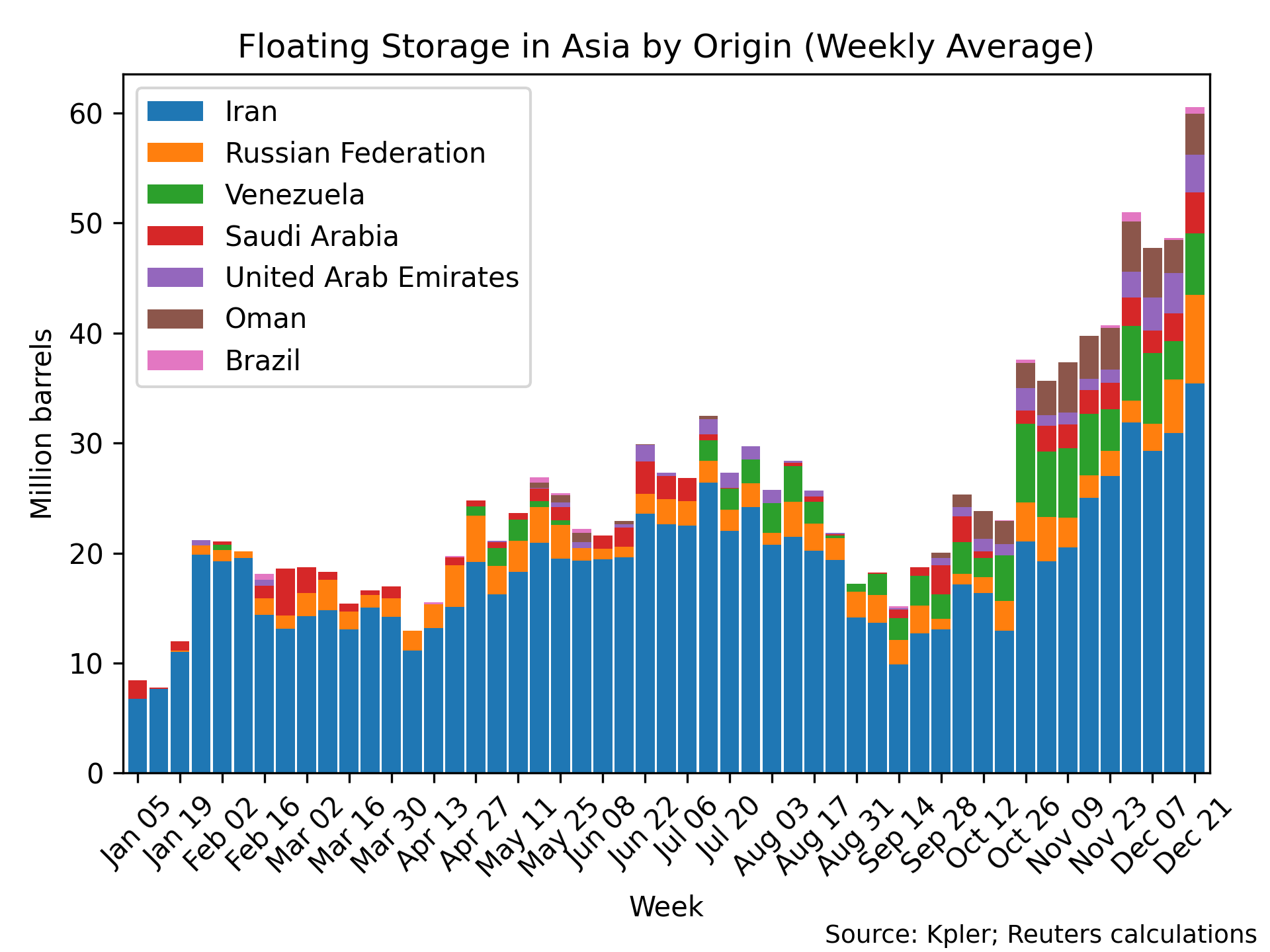 Asian oil floating storage hit 70.9 MMbbl on December 18, the highest since June 2022 and up from 21 MMbbl at the beginning of September, according to Kpler, a data and analytics provider. Iranian oil accounted for more than half of the stored crude at 38.9 MMbbl, the data showed.