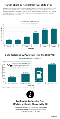 A new analysis from TechGaged Research reveals that combustion engines have officially become a minority in the European Union, marking a decisive and historic shift in the region’s automotive landscape. According to TechGaged’s research, petrol and diesel models accounted for just 36.6% of all new vehicles registered across the EU this year, signaling the rapid rise of electrified mobility.