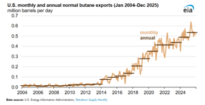 U.S. normal butane exports have increased every year since 2006, reaching a record-high average of nearly 535,000 bpd in 2025, a 9% increase from the previous year. Butane is used as a cooking fuel, a petrochemical feedstock, and a gasoline blendstock during the winter. Butane can also be converted to isobutane through isomerization, producing high-octane gasoline components. The United States exports a small amount of isobutane. Generally, butane demand has grown along with petrochemical demand. However, in many developing markets, governments have subsidized butane as a cleaner-burning replacement for other fuels (for example, wood or charcoal) for uses such as cooking or heating.