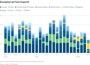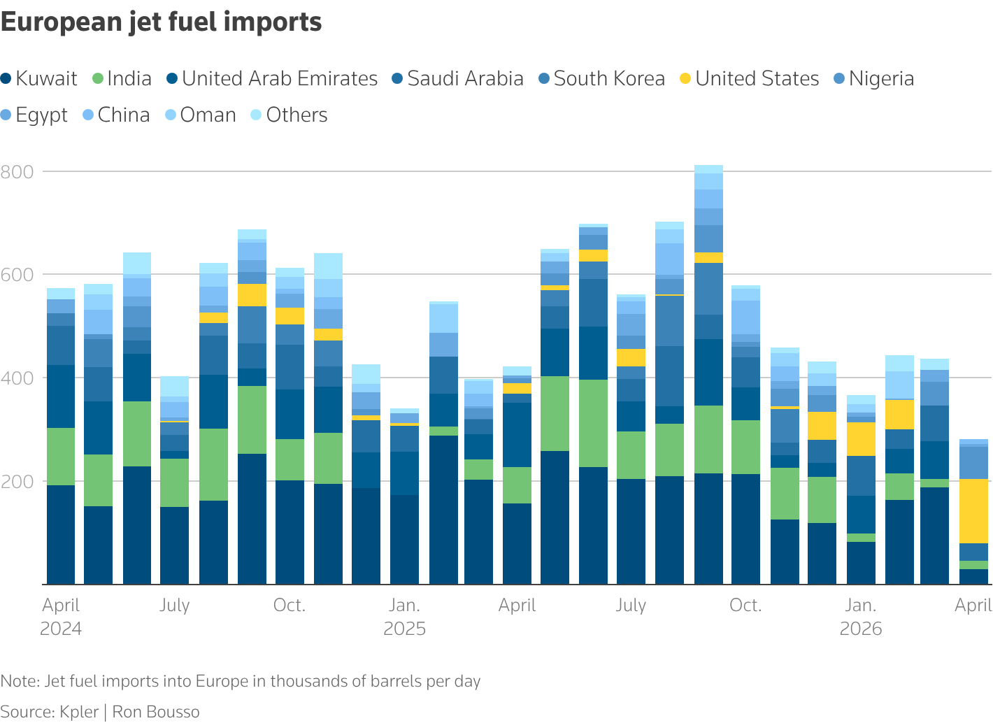 Europe has struggled to replace the lost Middle Eastern barrels. Jet fuel imports fell to roughly 437,000 bpd in March, down 13% from the 2025 average, and are set to slide further to just 275,000 bpd in April, according to analytics firm Kpler.